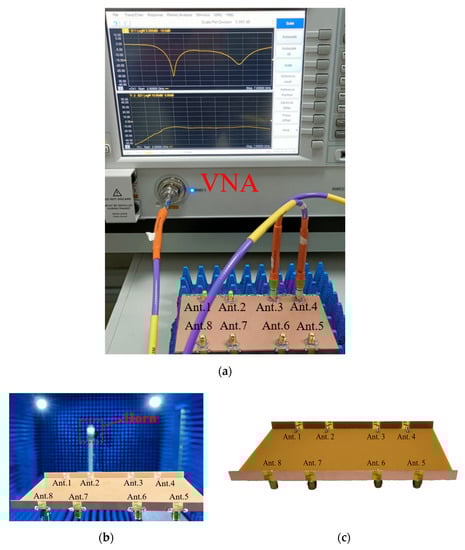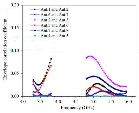 In this study, the imaginary part and real part of the S-parameters are measured by VNA, and the calculated envelope correlation coefficient (ECC) of the proposed eight-antenna MIMO system according to Equation (1).
