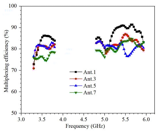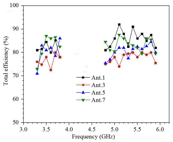 The calculated ME of the proposed MIMO antenna system is shown in Figure 10. The values of ME in the operating frequency bands are greater than 70%.