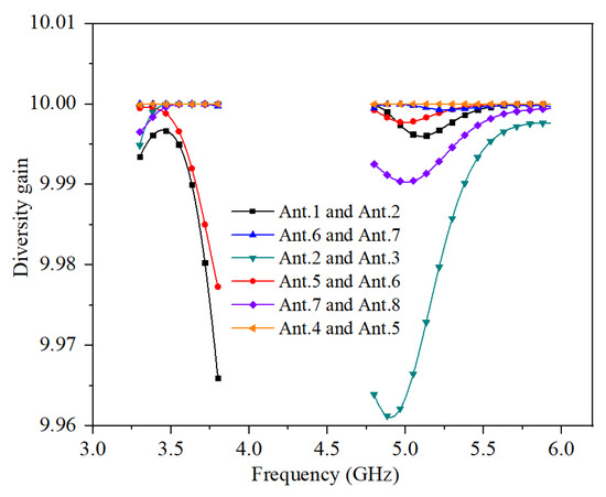 The calculated DG of the proposed MIMO antenna system is shown in Figure 9. The values of DG in the operating frequency bands are greater than 9.96.