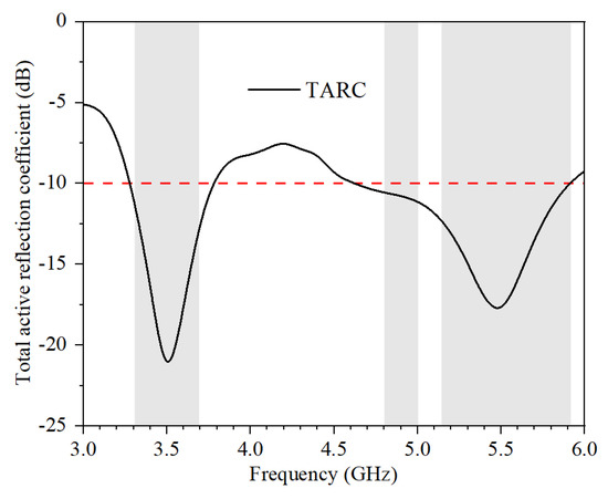 The total active reflection coefficient (TARC) is calculated from S-parameters in Equation (6).