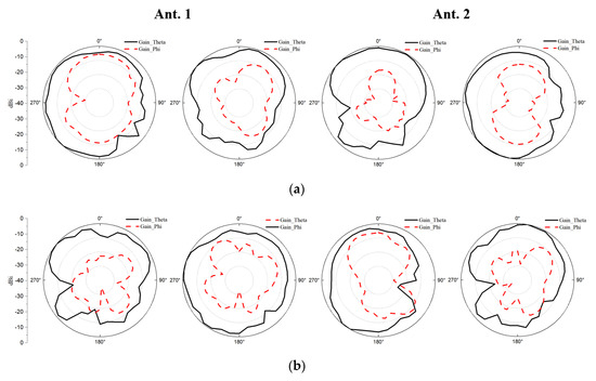 The radiation patterns of the proposed antenna element at 3.5 GHz, 4.9 GHz, and 5.5 GHz are shown in Figure 13. The measured co-pol and cross-pol are represented by solid and dashed lines, respectively. The cross-pol of all antennas is smaller than the co-pol. The co-pol and cross-pol of the same antenna are different at disparate frequency points. Since Ant.1 and Ant.2 have the same shape and different positions, radiation patterns are slightly similar, but not identical.