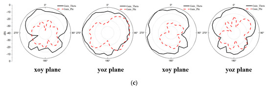 Figure 6 shows the simulated and measured coefficients. The antenna is measured by Keysight Vector Network Analyzer N5224A. It can be seen that the simulated and measured bandwidth can cover 3.3–3.8 GHz, 4.8–5 GHz, and 5.15–5.925 GHz. The isolation between different ports is larger than 13 dB. The slight frequency offset is due to excess solder.