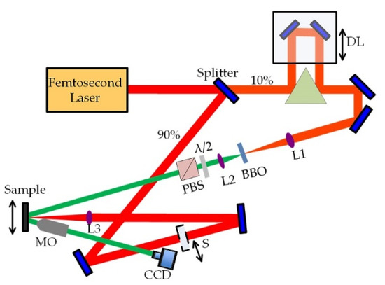Scheme of the experimental setup. Abbreviations: DL—delay line; L—lens; BBO—nonlinear crystal; λ/2—halfwave plate; PBS—polarized beam splitter; MO—microscope objective; CCD—camera; S—beam shutter.