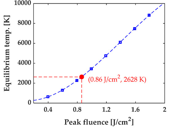 We further simulated lattice temperature at different laser fluences, using a Two-Temperature model (TTM) that will be described in the following section. Figure 5 shows that lattice temperature increased with increasing laser fluence, and silicon boiling temperature (2628 K [35]) was achieved at ~0.86 J/cm2. This indicates that the induction of the second ablation region is likely related to the fact that the material reaches its boiling temperature within this region.