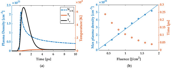 A TTM is employed to simulate three major phenomena in Si [30]: plasma generation, plasma temperature evolution, and lattice heating using Equations (2)–(4), respectively.
