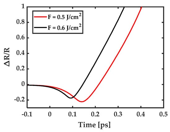 For fluences slightly above the ablation threshold (Figure 3a), a decrease in reflectivity relative to the initial value was observed at a delay time less than 0.7 ps. Afterward, the reflectivity increases and reaches an equilibrium state at about 10 ps.