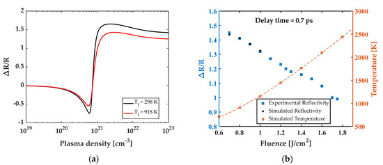 Figure 8b shows good agreement between the experimentally measured and the simulated saturated reflectivity at 0.7 ps. The relative reflectivity decreases with increasing temperature, induced by increasing fluence. It is worth noting that reflectivity is simulated only up to fluence of 1.0 J/cm2, due to the data limitation of temperature-dependent refractive index [38].