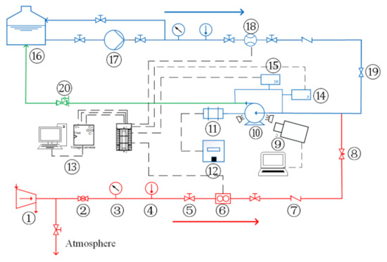 Schematic diagram of visual experimental system for gas–liquid two-phase flow of centrifugal pump: 1-air compressor; 2-ball valve; 3-pressure meter; 4-thermometer; 5-globe valve; 6-gas flowmeter; 7-check valve; 8-needle valve; 9-high speed camera system; 10-test pump; 11-electric motor; 12-frequency converter; 13-data acquisition system; 14-pressure transmitter; 15-differential pressure transmitter; 16-water storage tank; 17-multistage centrifugal pump; 18-water mass flowmeter; 19-regulating valve; 20-back pressure regulator (gate valve).