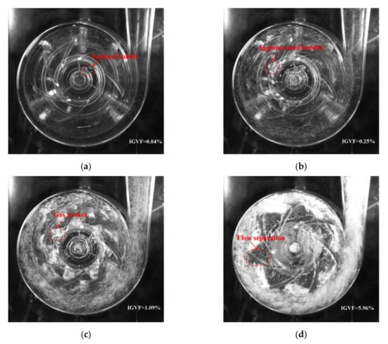 Figure 2 shows four typical flow patterns, i.e., bubble flow (BF), agglomerated bubble flow (ABF), gas pocket flow (GPF) and segregated flow (SF), in the impeller at different inlet gas volume fraction obtained by the high-speed camera. The rotational speed N = 1200 rpm and the liquid phase flow rate QL = 5.7 m3/h. The features of these flow patterns have been well described in references [,,,,,].