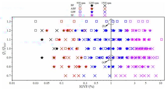 In addition, it can be seen from Figure 3 that the flow pattern was affected by the liquid phase flow rate. The flow pattern in the impeller was an SF pattern when the liquid phase flow QL/QBEP was 0.9 under N= 900 rpm and IGVF = 1% (see (a) in Figure 3). When the QL/QBEP increased to 1.3, the flow pattern in the impeller changed to GPF (see (b) in Figure 3). At the same time, rotational speed also affected the flow pattern in the impeller. For instance, as the rotational speed increased from 900 rpm to 1200 rpm or 1500 rpm, the flow pattern changed from the SF to GPF under QL/QBEP = 0.9 and IGVF = 1% (shown in (a) of Figure 3). It is suggested that the accumulation and retention of gas in the impeller can be reduced by increasing the liquid flow and rotational speed, thus improving the gas carrying capability of the pump. Therefore, we concluded that the flow pattern in the centrifugal pump was related to the inlet gas volume fraction, the liquid phase flow rate, the pump rotational speed and the pressure increment. Because of the complexity of the pump flow pattern, the transition boundary between the regimes is still difficult to quantitatively determine []. The data of the present experiment are available in the Supplementary Materials as Table S1: Experiment data of the flow pattern in the impeller.