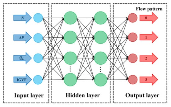 When the number of hidden layers is one, various functions containing continuous mappings from one finite space to another finite space can be fitted; when a number of hidden layers are double-layer, various precision decision boundaries can be represented with appropriate activation functions, and smooth mappings of various precision can be fitted. In order to make the network model effectively learn the flow characteristics of gas–liquid two-phase flow and accurately predict various flow patterns under different working conditions, a double-layer hidden layer was selected for flow pattern identification in this paper.