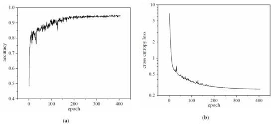 Accuracy was selected as the evaluation function of the network, as shown in Figure 6a. With the increase of the iteration numbers (epoch), the accuracy shows an upward trend and finally tends to stabilize. When the accuracy barely increases with iterations, the network training comes to an end. The accuracy of the network model on the present training set was 0.95. Figure 6b shows the iterative curve of the cross-entropy loss function. With the increase of the iteration numbers, the loss value of the network continues to decline and finally tends to stabilize.