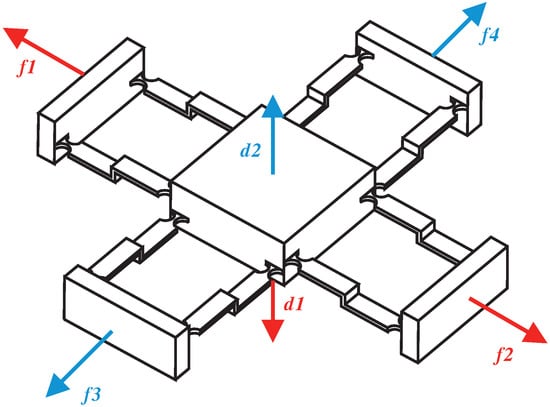 In this paper, it is essential to rationally use and arrange the Z-shaped flexure hinges in order to realize XYZ bi-directional motion. The Z-shaped flexure hinges can change the direction of movement and amplify the output displacement by bending deformation. Figure 1 shows the working principle of Z-shaped flexure hinges. The rigid body is laid out in the middle, and symmetrical Z-shaped flexure hinges are arranged on both sides of the rigid body. Z-shaped flexure hinges would produce deformation because of bending when force or displacement to both ends is imposed. The direction of bending deformation is related to the layout of the Z-shaped flexure hinges. As shown in Figure 2, when a pair of Z-shaped flexure hinges with opposite directions are arranged on the X-axis and Y-axis, respectively, the moving platform in the middle can move up or down on the Z-axis relative to the origin.