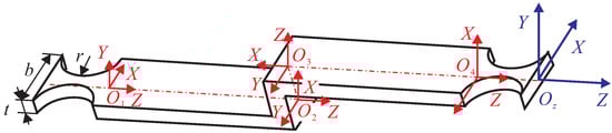 As shown in Figure 4, the Z-shaped flexure hinge is composed of three leaf-type flexure hinges in series, and the middle one is perpendicular to the other two. In this paper, the semicircular notched hinges are adopted at the two ends of the Z-shaped flexure hinges to ensure their guiding function. Therefore, the Z-shaped flexure hinge can be regarded as a series of five hinges. The compliance of the five compliant hinges are added in series and converted to the O 5 , which is the origin of the global coordinate system. The output compliance of the Z-shaped flexure hinge can be obtained as follows: