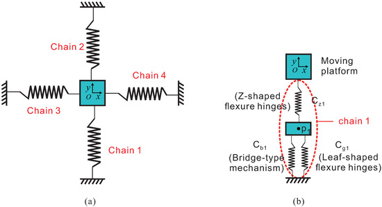 As shown in Figure 6, the whole platform consists of four chains which are marked by 1, 2, 3 and 4. Each of the chains has a similar construction and they are in parallel. Figure 6b shows that chain 1 is composed of the bridge-type mechanism, the leaf-shaped flexure hinges and the Z-shaped flexure hinges. The bridge-type mechanism is firstly connected in parallel with the leaf-shaped flexure hinges. Subsequently, they are connected in series with the Z-shaped flexure hinges. Finally, the Z-shaped flexure hinges are connected with the moving platform. In this section, the output compliance of chain 1 is firstly calculated. According to the parallel relationship, the compliance of the bridge-type mechanism and leaf-shaped flexure guide beams at point P 1 can be obtained: