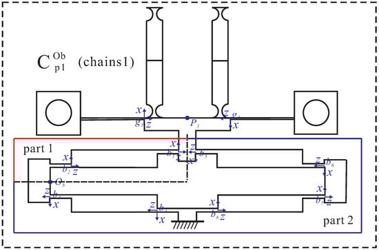 Since the compliance of the four branch chains of the platform are nearly equal, the input compliance of the platform at the bridge-type mechanism in branch chain 1 on the Y-axis can be calculated as an example. As shown in Figure 7, branch chains 2, 3, and 4 can be regarded as parallel chains and they are connected in series to branch chain 1. Firstly, the compliance of the three parallel chains 2, 3, and 4 at O b point can be calculated as: