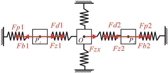 The equivalent rigid body and force diagram of motion characteristics on the X-axis of the platform is shown in Figure 8. The flexure hinges are regarded as springs on the X-axis, and the Z-shaped flexure hinges on Y-axis are also regarded as springs. In this case, one of the actuators or both of them can be driven on the X-axis.