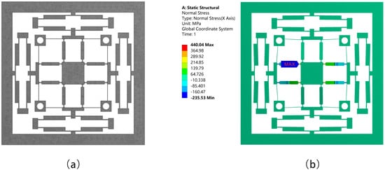 Figure 10. Meshing method and maximum stress: (a) meshing method of the platform; (b) the maximum stress.