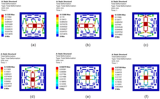 Figure 11. Total displacements along the XYZ three directions: (a) along X-axis positive direction; (b) along X-axis negative direction; (c) along Y-axis positive direction; (d) along Y-axis negative direction; (e) along Z-axis positive direction; (f) along Z-axis negative direction.