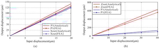 Figure 12. Relationship between the input displacement and output displacement: (a) only the left side of the X-axis applies input displacement; (b) both sides of X-axis have input displacements applied.