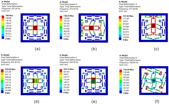 Figure 13. The first six natural frequencies of the platform: (a) the first natural frequency; (b) the second natural frequency; (c) the third natural frequency; (d) the fourth natural frequency; (e) the fifth natural frequency; (f) the sixth natural frequency.
