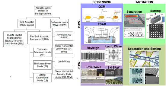 Figure 1. (a) Classification of acoustic wave modes used for bioapplications and (b) schematic representation of acoustic waves in biosensing and actuation application.