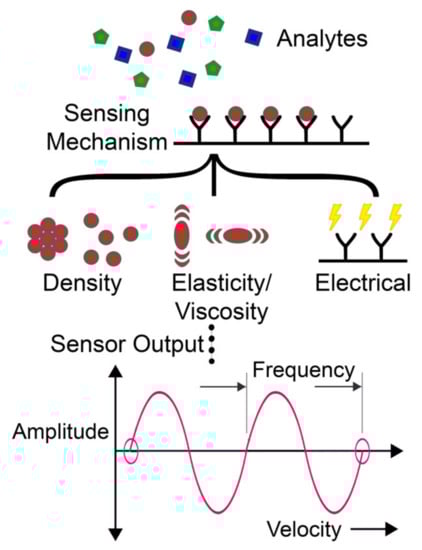 Figure 2. Basic working principle of acoustic biosensor showing the sensing mechanism. The sensor responds to the mass, viscosity, or electrical properties of the analytes which reflect as variation in the acoustic wave amplitude, phase/velocity, or frequency in the sensor output.