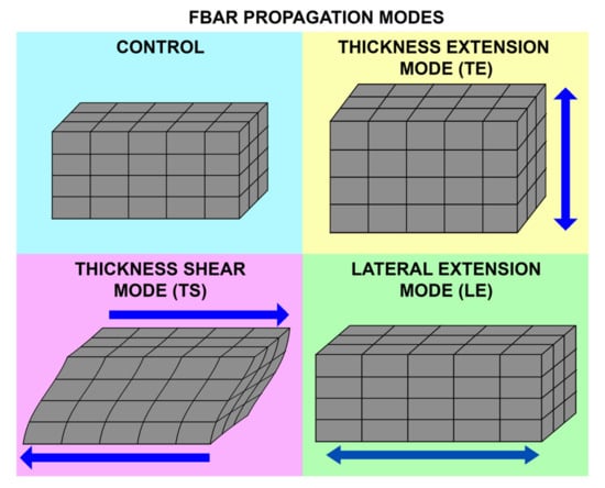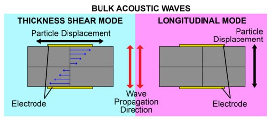 Bulk acoustic waves (BAWs) are generated when bulk piezoelectric elements, such as ceramic substrates or plates and thin films, are excited by metallic electrodes, generally Au coated on the top and bottom faces [26]. Upon the application of an alternating electric field (EF) across the electrodes, the potential difference induces a mechanical deformation due to the inverse piezoelectric effect mentioned earlier. This deformation, in turn, induces mechanical waves propagating into the bulk of the material perpendicular to its surface, hence its name. The wave travels through the material and is reflected from the bottom substrate surface, resulting in a constantly oscillating mechanical standing wave. The frequency of oscillation is characterized by the piezoelectric material density, elastic constant, and the thickness of the material [58]. BAWs can mainly propagate in either a longitudinal mode or transverse mode, based on the direction of particle displacement relative to the wave propagation direction. The propagation mode is mainly governed by the crystal cut orientation of the bulk piezoelectric material, as well as the orientation of electrodes with respect to the c-axis of piezoelectric thin films [41,59,60]. Transverse mode, also named thickness shear mode (TSM), has the particle displacement perpendicular to the wave propagation direction and parallel to the substrate surface. The longitudinal mode has particle displacement in the same direction as that of the wave propagation. The propagation modes are shown in Figure 3. For biosensing applications, the thickness shear mode of operation of BAWs is preferred, due to the reduced coupling of the acoustic energy with the liquid medium in contact, which results in reduced acoustic damping [61].