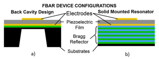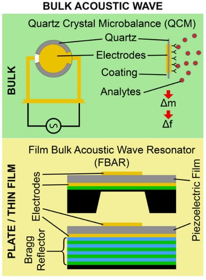 BAW biosensors are generally made up of two types of waveguiding structures, namely the bulk substrate and plate/thin-film membrane, as shown in Figure 4. Quartz crystal microbalance (QCM) falls under the bulk substrate category, in which the acoustic wave propagates into the bulk substrate. Film bulk acoustic wave resonators (FBARs) fall under the plate/thin-film category, in which the acoustic wave propagates in thin piezoelectric plates or film membranes [1,26]. Among the types of BAW biosensors mentioned above, the architecture for QCM and FBAR devices is similar, except for the use of the bulk substrate for the former and the thin piezoelectric deposited film membrane for the latter.