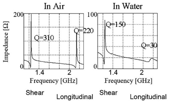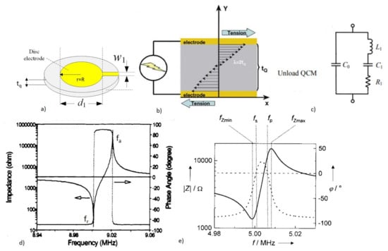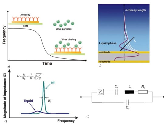 Equations (5) and (8) indicate that the QCM will respond to both mass and liquid loading, and that the total frequency change will have a contribution from both [68]. When the QCM is in contact with a liquid medium, acoustic energy loss and dissipation occur and this can lead to the lowering of the Q factor, as shown in Figure 6c. The lowering of the Q factor due to liquid loading can be explained using the BVD model, as shown in Figure 6d, with loading impedance Z1m added to the series motional arm. The energy dissipation, due to the liquid loading, results in an increase in motional impedance and causes the broadening and reduction in amplitude of the impedance response [58,68].