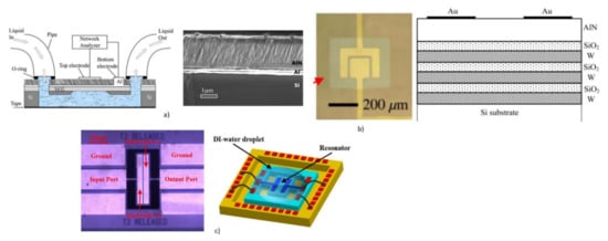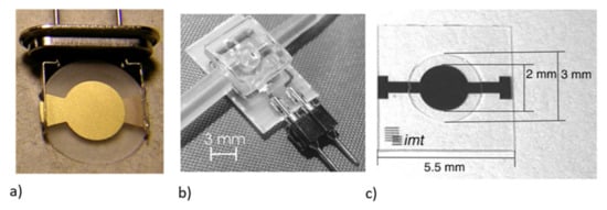 Figure 7. (a) Optical image of a standard QCM resonator with an Au electrode of diameter 4 mm [103]. Reproduced with permission from Henrik Anderson et al., Sensors and Actuators B: Chemical; published by Elsevier, 2007. (b) QCM integrated with a PDMS flow channel for sensing in liquid medium [105]. Reproduced with permission from Monika Michalzik et al., Sensors and Actuators B: Chemical published by Elsevier, 2005. (c) Optical image of an HFF QCM with an Au electrode with a thin quartz 3 mm diameter membrane [105]. Reproduced with permission from Monika Michalziket al., Sensors and Actuators B: Chemical; published by Elsevier, 2005.