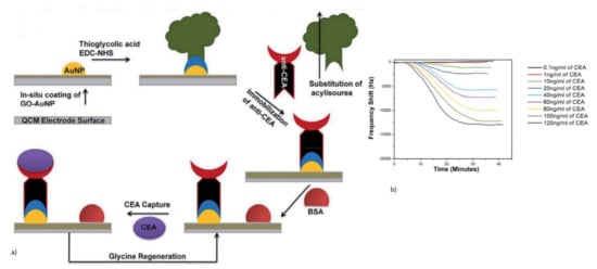 CEA is one of the most commonly used cancer biomarkers for the clinical diagnosis of lung and breast cancer. A QCM sensor operating at 5 MHz was reported for the real-time detection of CEA using an anti-CEA monoclonal antibody as a bioreceptor [112,135]. A novel method of a graphene oxide-Au nanoparticle-coated Au electrode was used for the immobilization of the anti-CEA antibody bioreceptor [112]. The schematic representation of this direct immunoassay is shown in Figure 8a. The reduction in the resonant frequency of the QCM was observed with the target CEA captured by the antibody due to mass loading. The sensor responded to varying concentrations of the target CEA with an increase in the frequency shift, as shown in Figure 8b. The device showed a LOD of 0.06 ng/mL for the QCM with an oxygen plasma-treated Au electrode. A more sensitive and lower LOD for the CEA detection was demonstrated with the QCM combined with enzymatic biocatalytic precipitation (EBCP) for the mass amplification [135]. The technique employed here further lowered the LOD of the QCM biosensor to 7.8 pg/mL.