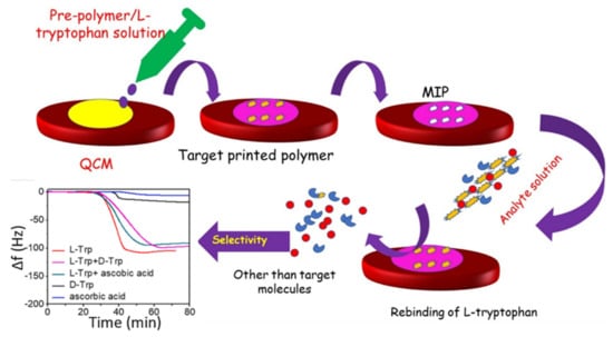 A QCM with a molecularly imprinted polymer (MIP) as a bioreceptor layer on the Au electrode has been reported for the detection of proteins and disease biomarkers in human serum, such as tryptophan (Trp) and the HIV-1 glycoprotein [124,129]. MIPs are a special type of polymer, synthesized with a cavity that specifically matches the shape, size, and functional groups of the target analytes [129]. L-Tryptophan (Trp), which is one of the essential amino acids in the human body for the development of neurotransmitters, is considered a biomarker for neurological disfunctions [138]. The MIP synthesized using methacrylic acid (MAA) as a monomer with a Trp template and an ethylene glycol dimethacrylate (EGDMA) crosslinker was coated onto the Au electrode of QCM, to act as a bioreceptor for the specific and sensitive detection of Trp [129]. The device showed an LOD of 0.73 ng/mL. The schematic of the QCM sensor with the MIP as the bioreceptor, is shown in Figure 9.