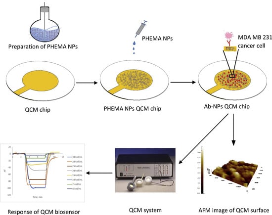 The QCM Au electrode surface coated with Poly (2-hydroxyethyl methacrylate) nanoparticles (PHEMA-NPs), were used for the immobilization of antibodies specific to the notch-4 receptor for the detection of the metastatic potential of human breast cancer cells with an overexpression of the Notch 4 receptor [114,141]. The schematic of the QCM chip used for the detection and resulting frequency response, is shown in Figure 10. The device exhibited excellent selectivity with an LOD of 12 cells/mL and was capable of reuse after the regeneration of the sensor surface. The metastatic potential of the tumor cell can also be detected from the cell mechanical property, including stiffness [143]. Metastatic tumor cells tend to be less stiff, which can be detected by the QCM-D via the monitoring of the dissipation factor. The QCM-D, with the Au electrode coated with poly-L-lysine, was used for the capture of CD44 overexpressed tumor cells [141].