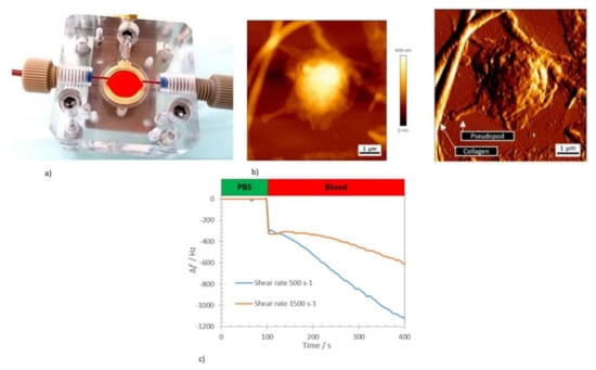Figure 11. (a)Blood perfusion chamber with a QCM biosensor. (b) AFM image of platelet deposit on the collagen-coated QCM sensor surface. (c) Real-time monitoring of frequency shift at various wall shear rates to imitate the physiological blood microcirculation condition in the human body, showing the interaction of the platelet with collagen [144]. Reproduced with permission from Oseev A et al., Nanomaterials; published by MDPI, 2020 (open access).