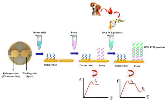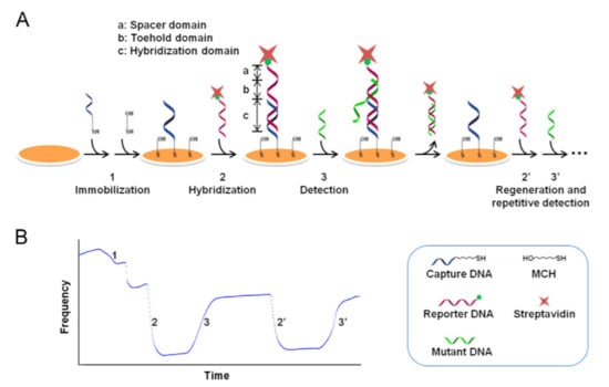 Nucleic acid biosensors have been receiving importance as a clinical diagnostic tool, due to the significance of gene study and infectious disease analysis [20]. An accurate DNA biosensor, with rapid, real-time, and label-free detection, suitable for POC applications, can be realized by using QCM for detecting DNA gene sequences. By using a complementary oligonucleotide probe as a bioreceptor on the QCM, the hybridization of target DNA results in the frequency drop of the biosensor due to mass addition. Improving the detection sensitivity of QCM is achieved by using mass amplification methods to enhance the frequency drop of the QCM [95,96,151].