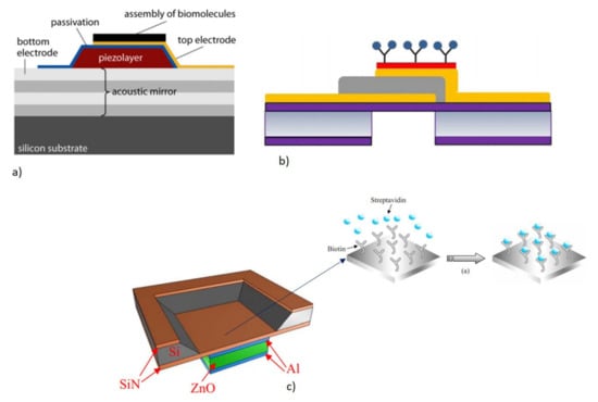 Acoustic biosensors play an important role in the development of miniaturized, portable devices for healthcare, food, environmental, and medical-related areas for consumer applications [26,38]. Accordingly, piezoelectric acoustic biosensors use acoustic waves generated by piezoelectric materials to extract information about the analytes [26]. For bulk material substrates, quartz, lithium tantalate (LiTaO3), and lithium niobate (LiNbO3) are commonly used [39]. Deposited piezoelectric thin films, including lead zirconate titanate (PZT), aluminium nitride (AlN), and zinc oxide (ZnO), are also used, providing enhanced piezoelectric properties with the capability of the miniaturization of acoustic devices [1].