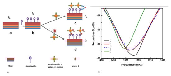The basic architecture of a QCM as a biosensor involves the functionalization of the top Au electrode with a bioreceptor layer, as shown in Figure 6a. Only one of the QCM electrodes faces the liquid biosensing medium, while the other electrode is isolated against air. This is performed to avoid the risk of electrical coupling between the two electrodes when operating in a low electrical impedance medium [23]. Bioreceptors can be a layer of antigen, antibody, aptamers, nucleic acids, synthetic peptide chains, or molecularly imprinted polymers (MIP), which are bound to the Au electrode by physisorption, covalent bonding, or electrostatic interaction [71,72,73,74,75]. The bioreceptors make the QCM sensors selective and specific, which selectively adsorb the target analyte from the sensing medium and enables label-free detection.