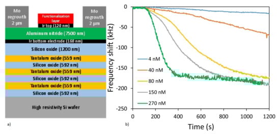 The performance of the QCM biosensor is normally quantified using mass sensitivity (Sm), as represented by Equation (6), and limit of detection (LOD) [77]. LOD represents the minimum detectable mass by the sensor and can be calculated from the response of the QCM to the baseline buffer solution without the target analyte. LOD is calculated as [80]