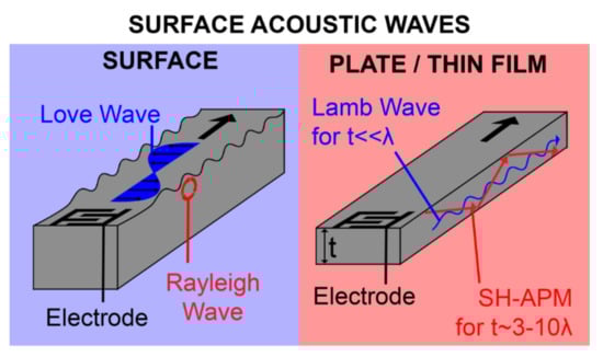 The acoustic waves are generated by the electromechanical transduction in the piezoelectric materials. The control of this mechanism is performed through the direct application of an alternating current (AC) electric field on a piezoelectric material that results in the generation of mechanical displacement by the inverse piezoelectric effect, which then propagates through the piezoelectric material as acoustic waves [40,41]. This property helps in the formation of compact and integrated piezoelectric acoustic biosensors by simply coating the bioreceptor layer onto the piezoelectric crystal [42].