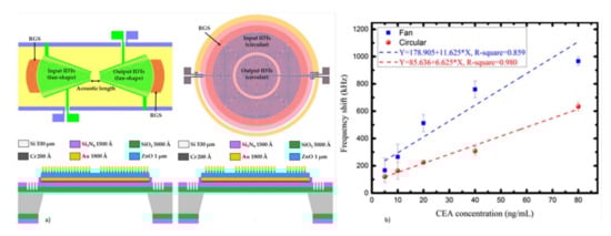 Figure 8. (a) Schematic of the surface functionalization of the anti-CEA antibody and sensing. (b) Increase in the resonant frequency shift with the CEA concentration [112]. Reproduced with permission from P. J. Jandas et al. [112], copyright 2020, RSC Advances; published by The Royal Society of Chemistry, Creative Commons (open access).