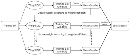 From the calculation formula of , it can be seen that, if the i-th sample is classified incorrectly, , which causes the weight of the sample to increase in the (k + 1)-th weak classifier. If the classification is correct, then the weight is reduced in the (k + 1)-th weak classifier. Only one weak classifier is trained for each iteration, and the trained weak classifier will be used in the next iteration. That is to say, in the N-th iteration, there are a total of N weak classifiers, of which (N − 1) weak classifiers are previously trained, and their various parameters are no longer changed. Among them, the relationship of the weak classifiers is that the N-th weak classifier is more likely to match the data that the other weak classifiers did not match, and the final classification output depends on the comprehensive effect of these N classifiers.
