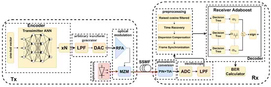 Figure 1 shows a schematic diagram of the entire end-to-end optical communication system. The characteristic of fiber dispersion is that it will lead to the ISI effect from the front and back symbols to the current symbol. We consider optimization of the end-to-end design by replacing ANN with the Adaboost algorithm on the receiver to reduce the computation complexity, at the cost of sacrificing BER performance of the whole optical fiber system (detailed analysis in Section 3). The ANN at the transmitter encodes the message . Binary Random Sequence generated by the Python Numpy Library [] is a bit stream consisting of only a unipolar signal (0,1). Therefore, a few bits from this bit stream represent the message m and are encoded into a one-hot vector. Thus, the message m is expressed as a one-hot vector (containing “1” at position m and zero at other positions), and then processed by ANN to obtain n samples to form a waveform. The obtained waveform is upsampled for each sequence point by  times, and then transmitted to a low-pass filter (LPF) and the fiber channel.