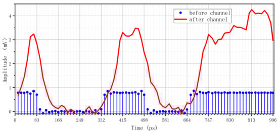 The  in the formula means the waveform after the 33 MHz LPF, and we first considered the noise of DAC (detailed description in Section 2.3). All the noise we considered is modeled as a Gaussian noise model.  is modeled as MZM, which is . MZM in the simulation is designed as a sine function which can express in the range of [−π/4, π/4]. The influence of chromatic dispersion in the optical fiber channel on the signal is . The influence of chromatic dispersion is added only in the frequency field; therefore, the time domain signal is converted to the frequency domain and multiplied by a parameter  to represent the effect of dispersion ( means Fiber dispersion parameter,  means distance length, and  means the angular frequency). Modulo square calculation is expressed as a photoelectric square law conversion. Therefore, the optical fiber is modeled as an intermediate medium that only provides attenuation and dispersion.