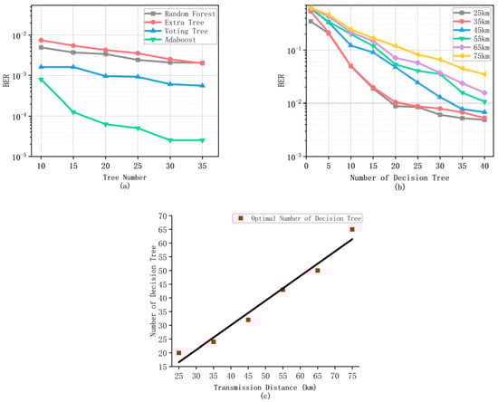 The bit error rate performance of the Adaboost algorithm, Random Forest, Extra Tree, and Voting Tree with the number of Decision Trees (a) and the Adaboost algorithm with the number of Decision Trees between 25 km to 75 km (b) and the relationship of the Adaboost algorithm with distance and its number (c).