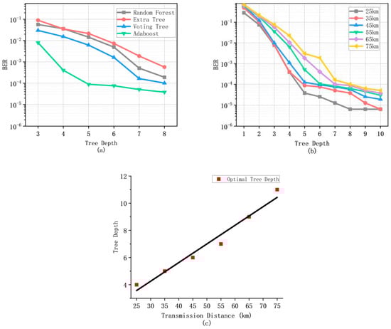 The bit error rate performance of Adaboost, Random Forest, Extra Tree, Voting Tree with the depth of Decision Trees (a) and the Adaboost algorithm with the depth of Decision Trees between 25 km to 75 km (b) and bit error rate performance of the Adaboost algorithm with its depth (km) (c).