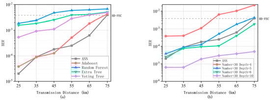 As shown in Figure 8, we first analyze the advantages and disadvantages between the neural network and Adaboost algorithm. For an autoencoder using a symmetrical neural network, it can be seen that it can still be lower than the adopted HD-FEC threshold for a long distance, and the output is relatively stable between 35 km and 65 km, but, at the distance of 75 km, the bit error rate will rise sharply because the inter-symbol interference caused by 75 km dispersion becomes more and more obvious, and the noise brought by the machine itself has gradually been able to compete with the power of its own signal. These are the reasons for the linear increase in the bit error rate. In addition, due to the usage of EDFA that amplifies the attenuated signal at more than 55 km, the output of 35–65 km is relatively stable as a result. Since the optical power emitted by the MZM has reached −7 to −8 dBm, the optical power obtained after 45 km has been lost to nearly −20 dBm. At this point, although neural networks and Decision Trees can still recognize symbols, they are already at the limit. Then, we analyze and compare the depth of the Adaboost algorithm Decision Tree. In the case of the same number of Decision Trees, it is obvious that the depth of the Tree will have a positive impact on data classification. However, too much depth is not our expectation. Due to limited experimental equipment, we cannot collect data to verify the performance of BER at different distances in order to analyze its robustness. We should be able to conclude that the Adaboost algorithm will be a certain degree of robustness at different distances. The reason is that, due to the relatively large number of Decision Trees, the Adaboost algorithm has a certain degree of robustness at different distances. However, compared to ANN, the figure of the BER performance will appear steeper in more changeable distance. Instead, compared to BiLSTM [], the BER performance will be much poorer due to having none of the memory function. At the cost of excellent BER performance, the computation is more complex than the method we proposed. At this time, the weighted decision of multiple Decision Trees is obviously problematic. We will conduct experimental research on this in our future work.