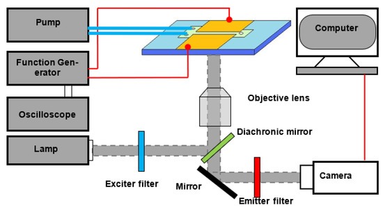 A syringe pump (Harvard, Model PHD2000 Programmable, Holliston, MA, USA) was used to pump fluorescent dye solution and DI water from the inlets respectively through the micromixer toward the outlet. Flow visualization were applied to study fluid mixing. Fluorescein sodium salt (C20H10Na2O5) was used as the fluorescent dye trace for characterizing the mixing results. Electrically neutral dye rhodamine B (Sigma-Aldrich, Corp., Burlington, MA, USA) was also used as the scalar marker to study conductivity ratio influence on fluid mixing. Phosphate buffer (VWR VW3345-1 pH 7.2) was diluted into DI water as one of the mixing streams to control the conductivity ratio between the two streams. Figure 2 shows the schematic of the experimental setup. The microchip was placed on an inverted fluorescent microscope (Olympus-IX70, Tokyo, Japan) for fluorescence measurements. A function generator (Tektronix, Model AFG3102, Beaverton, OR, USA) was used to apply AC electric signal between these two electrodes.
