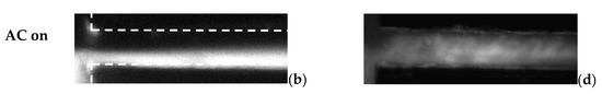 Visualization and comparison of mixing result in micromixer with electrodes located at ends of channel (a,b) and micromixer with conductive sidewalls (c,d), (a) without voltage, (c) with voltage; sidewall, (b) without voltage, and (d) with voltage.