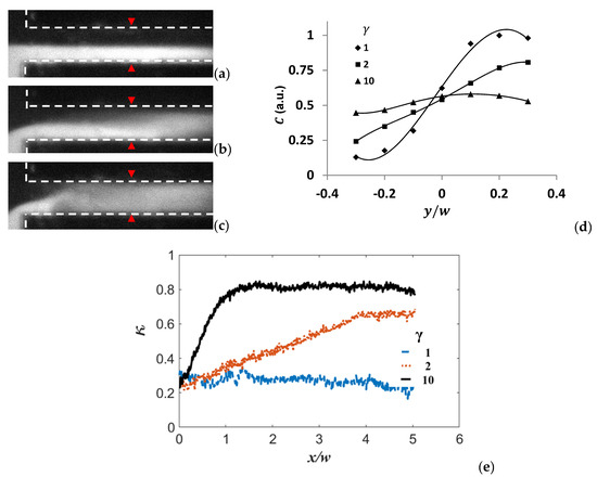 Mixing performances under different conductivity ratio are shown in Figure 4. Figure 4a,b indicates that the mixing is stronger at than that at. When (Figure 4c), the mixing is the strongest among these three cases. In Figure 4d, the corresponding concentration distribution (evaluated by fluorescence intensity) in the transverse direction is displayed. As we know, the stronger the mixing, the more uniform the concentration in the transverse direction at a given streamwise position. The curve should approach flat when the fluids are well mixed in the microchannel. According to Figure 4d, when the conductivity ratio is 10, concentration distribution reached a relatively uniform profile at ( is the width of the microchannel) from the entrance. While are 1 and 2, at the same streamwise position, C distributions were far away from a flat profile. The mixing result is evaluated by a mixing index , which is similar (but different) to the mixing criterion used in Arockiam et al.’s work [32] and is defined as: